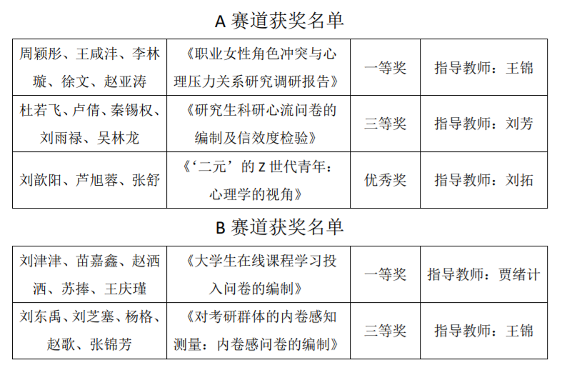 近日,由全国应用心理专业学位研究生教育指导委员会主办,北京师范大学心理学部、问卷网承办的“木铎杯”在线问卷调研大赛获奖名单正式揭晓。本次大赛由中国心理学会心理测量专业委员会、中国教育学会教育统计与测量分会指导,以拓展心理学应用场景、推广心理学应用工具、搭建心理学学习平台,助力高水平应用人才培养、推动研产学协同发展为目标,开设A、B两个赛道,其中A赛道为应用心理硕士专属赛道(一等奖10篇,二等奖20篇,三等奖28篇,优秀奖32篇,英文单项奖1篇);B赛道为开放赛道(一等奖9篇,二等奖19篇,三等奖27篇,优秀奖30篇,英文单项奖2篇)。