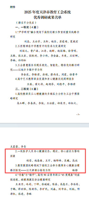 在我校工会统一部署下,各基层分会广泛参与,由我校胡莹、赵春健等老师完成的《一线医护人员身心健康状态:现状、核心症状与影响》调研报告和我校杨静老师完成的《教育强国战略视域下高校工会参与教师身心健康治理路径探究——以天津部分高校为例》调研报告荣获2025 年度天津市教育工会系统优秀调研成果二等奖。天津师范大学工会荣获优秀组织奖。