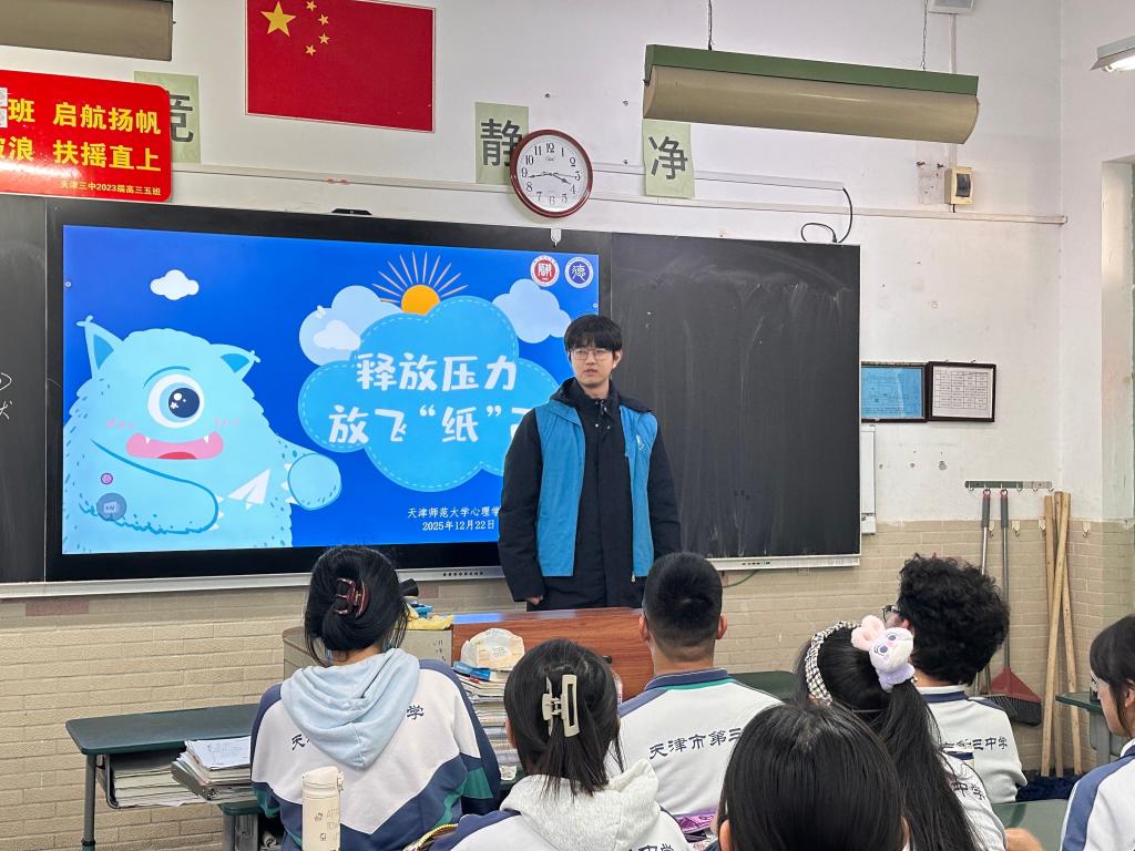为引导中学生科学应对考试压力,以积极健康的心态面对学习与生活,12月22日,天津师范大学心理学部志愿者团队走进天津市第三中学,开展主题为“释放压力,放飞‘纸’己”的心理团辅活动,为毕业班学子带来了一堂生动而温暖的心灵成长课。