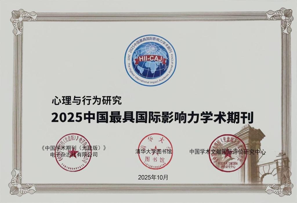 《心理与行为研究》再度入选“2025年中国最具国际影响力学术期刊”